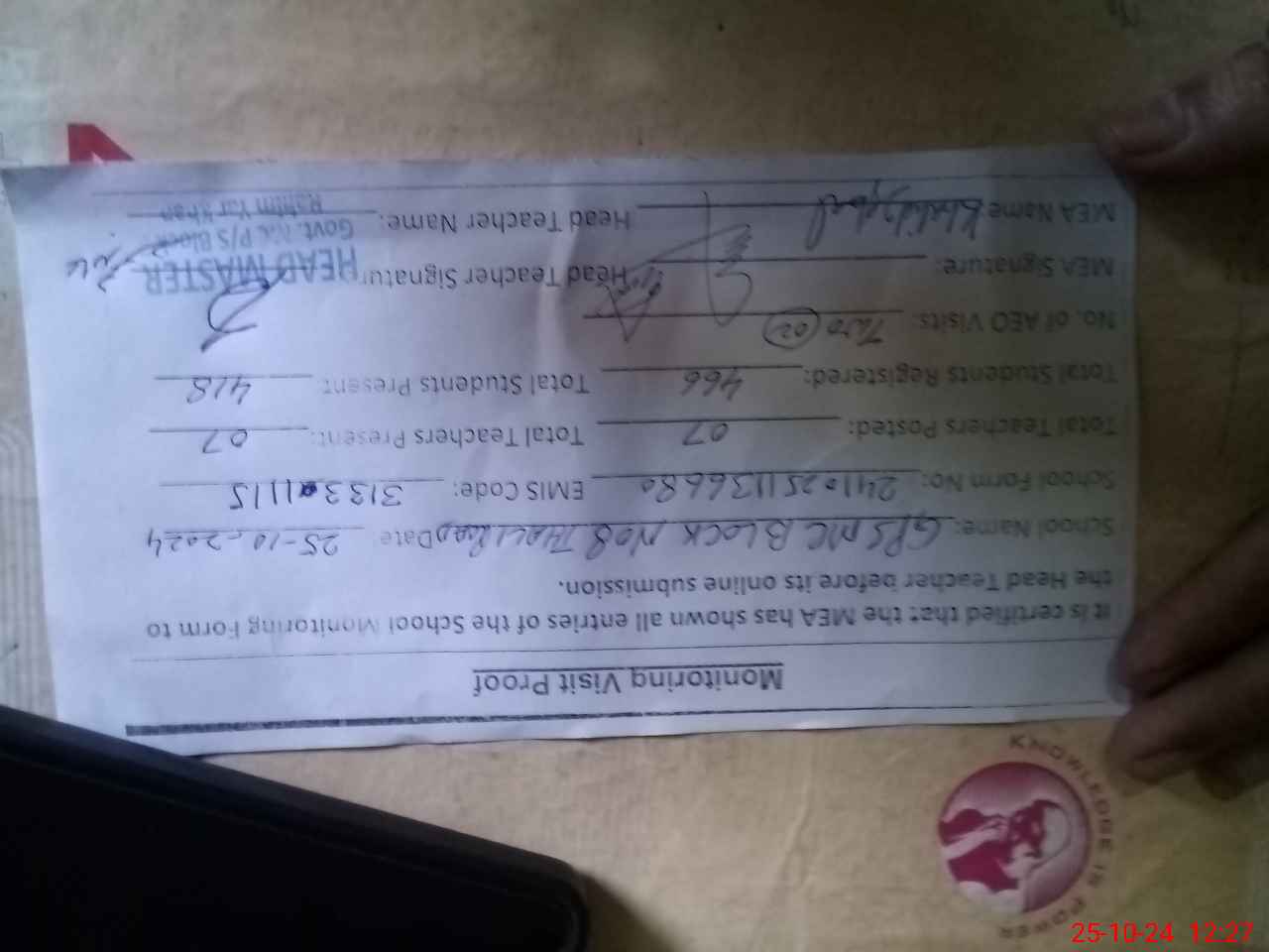| Attendance Register | Head Teacher | MEA with School | Visit Proof |