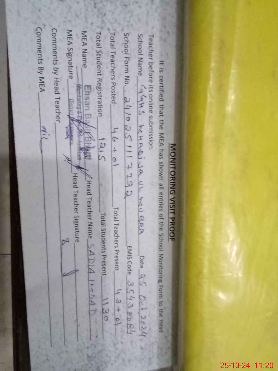 | Attendance Register | Head Teacher | MEA with School | Visit Proof |