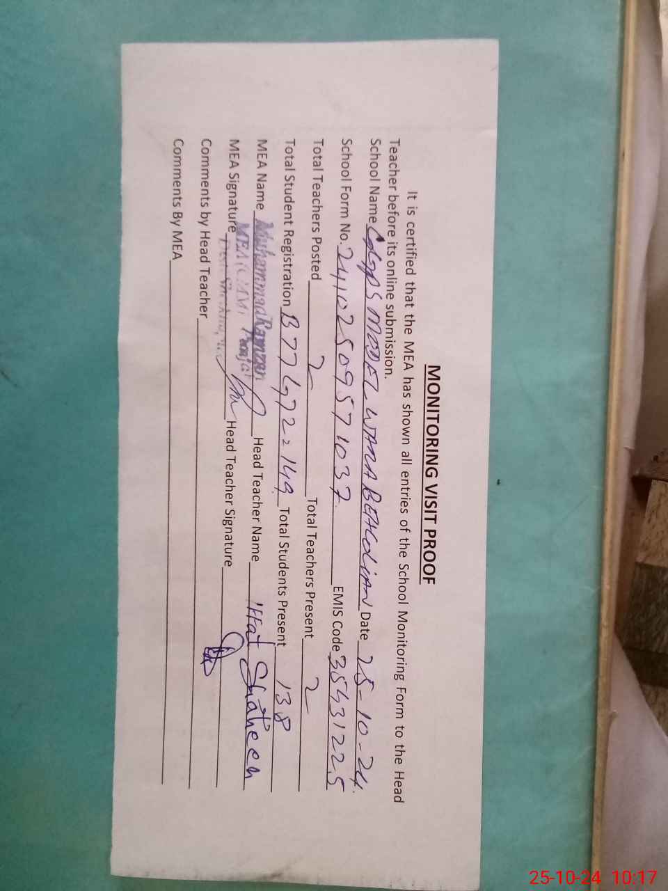 | Attendance Register | Head Teacher | MEA with School | Visit Proof |
