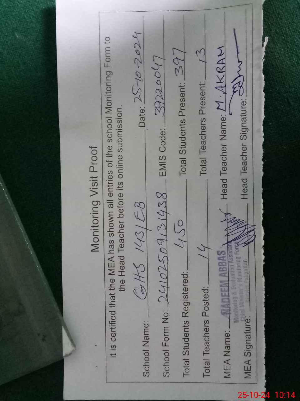 | Certified that this School was Inspected by the Undersigned MEA/DMO Today and the Information Stated Above is as Per Record. | |||||