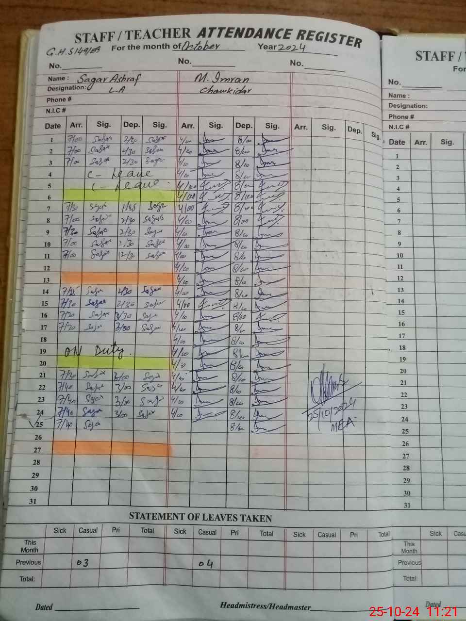 | Leave | Duty | Absent | Maternity | Medical | Ex- Pak |