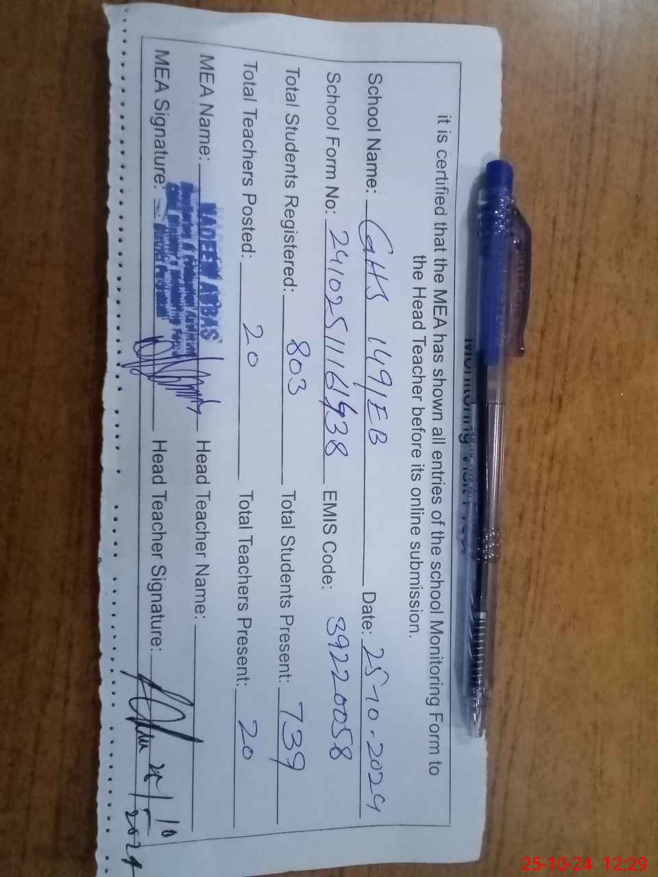 | Certified that this School was Inspected by the Undersigned MEA/DMO Today and the Information Stated Above is as Per Record. | |||||