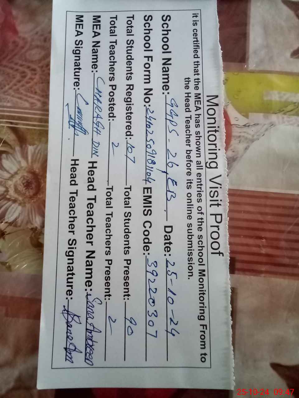 | EMIS Code: 39220307 | Name of School: GGPS 26 EB | |||