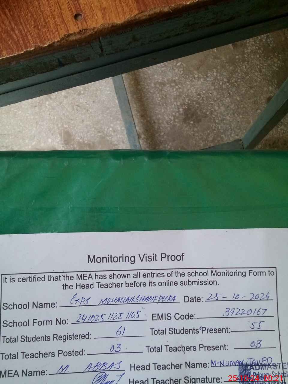 | Certified that this School was Inspected by the Undersigned MEA/DMO Today and the Information Stated Above is as Per Record. | |||||