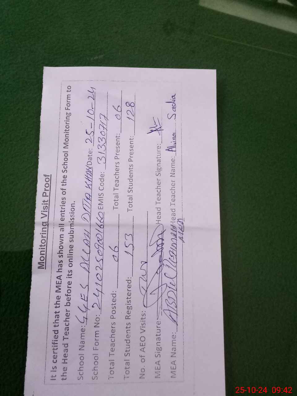 | Certified that this School was Inspected by the Undersigned MEA/DMO Today and the Information Stated Above is as Per Record. | |||||