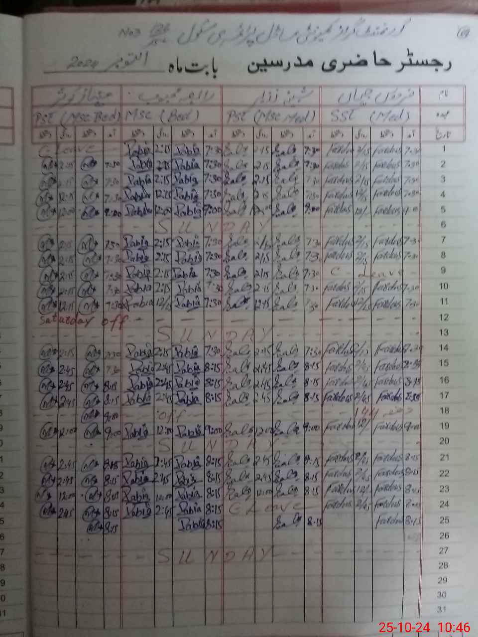 | Leave | Duty | Absent | Maternity | Medical | Ex- Pak |