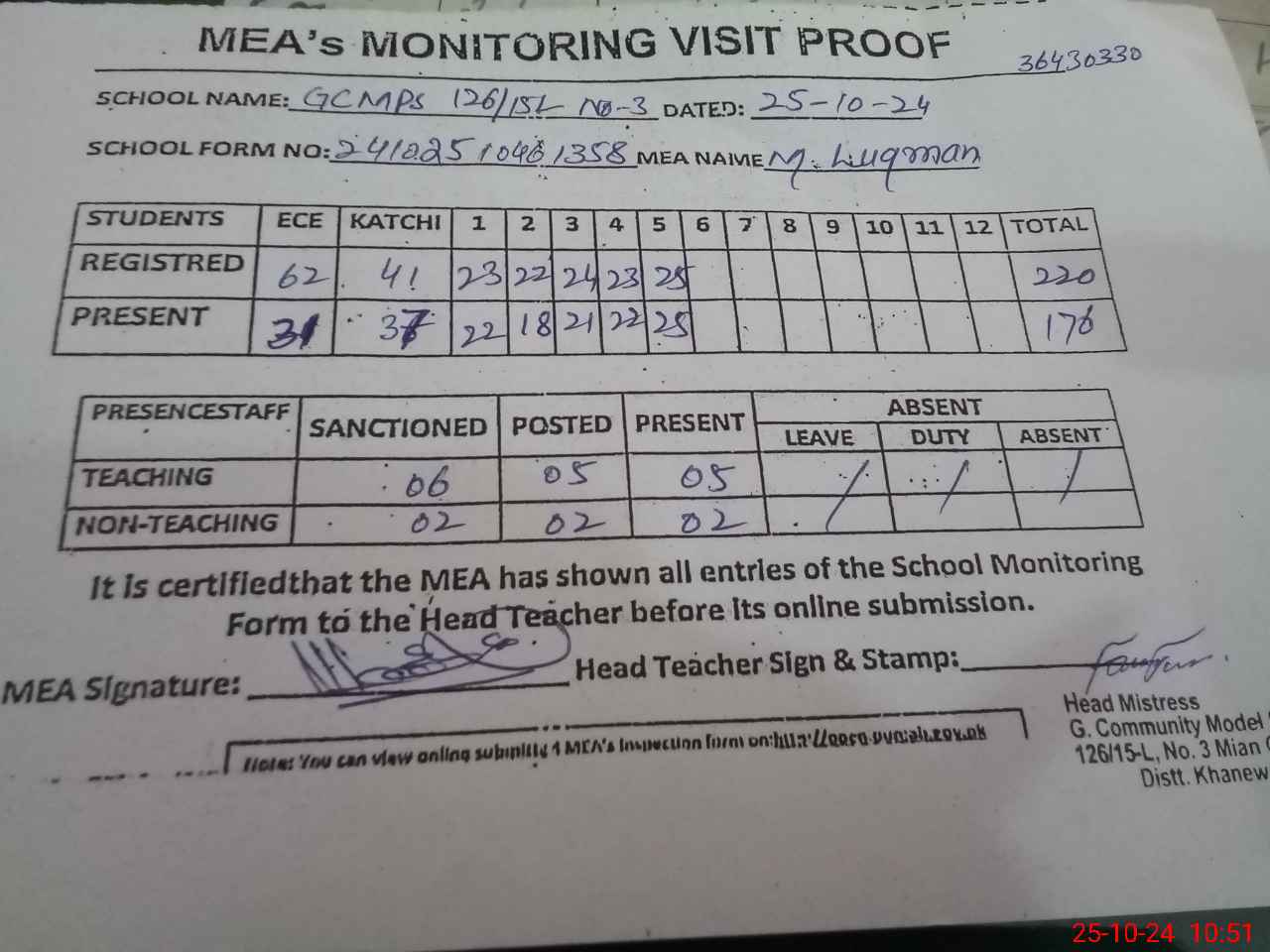 | Certified that this School was Inspected by the Undersigned MEA/DMO Today and the Information Stated Above is as Per Record. | |||||