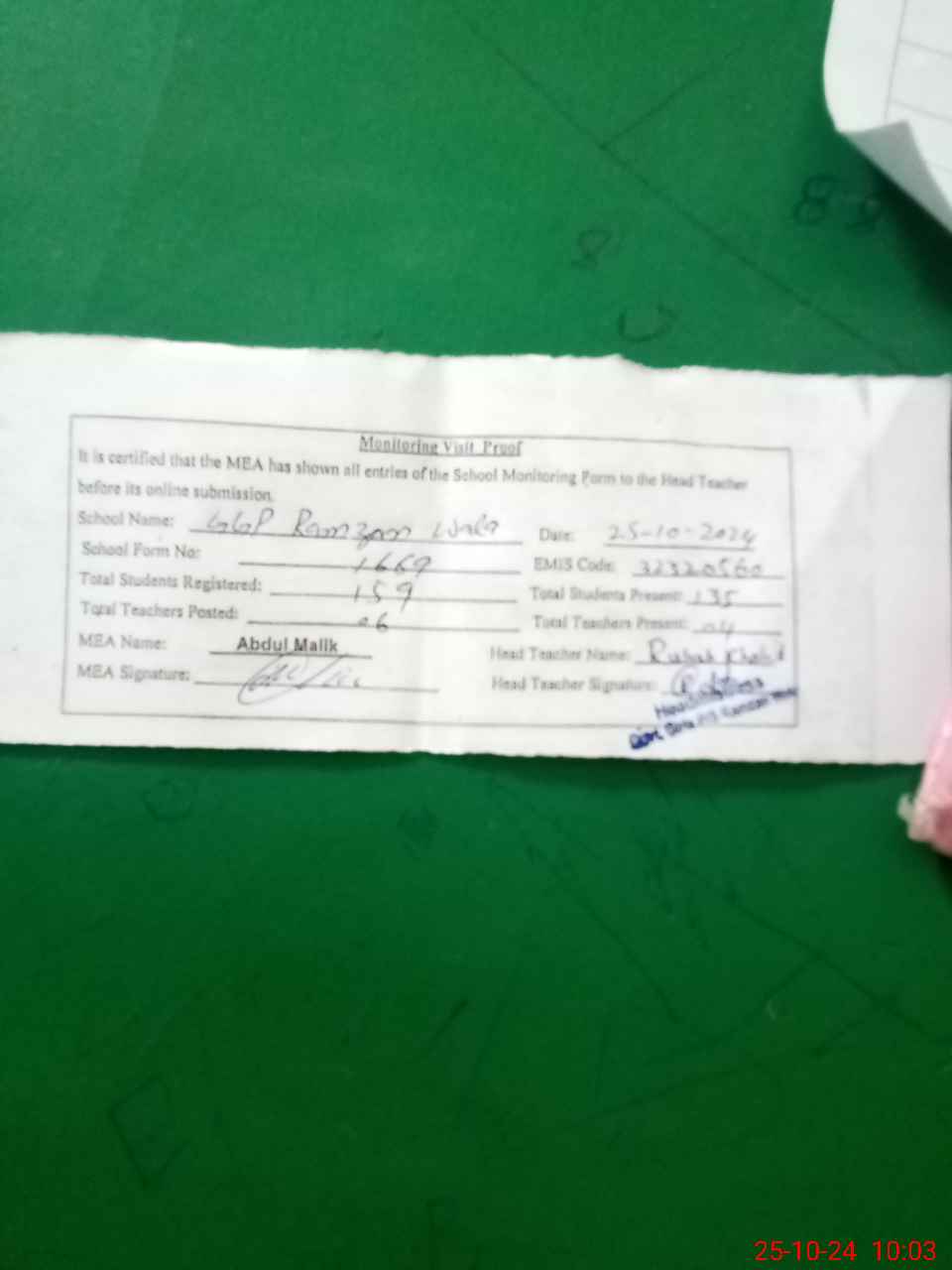 | Attendance Register | Head Teacher | MEA with School | Visit Proof |