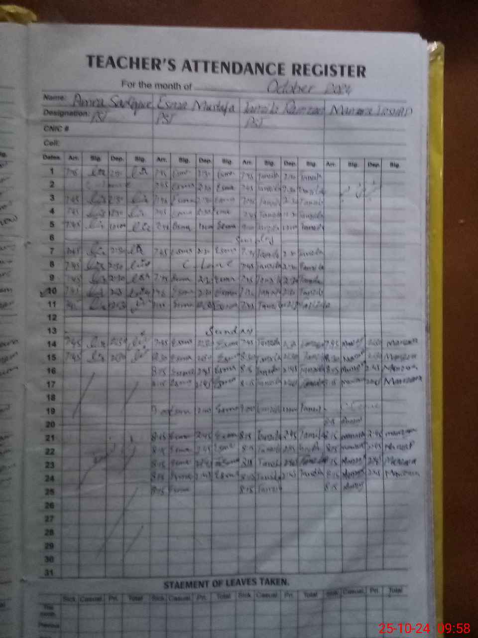 | CNIC | Full Name | Designation | R/C | Absence During Last Calender Month |