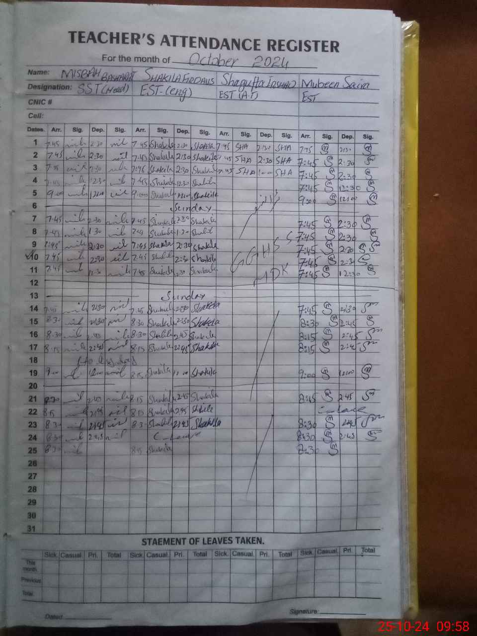 | CNIC | Full Name | Designation | R/C | Absence during last cal. month |