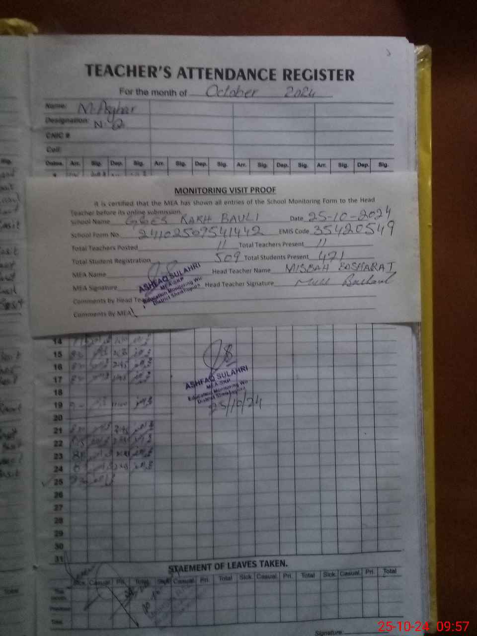 | Attendance Register | Head Teacher | MEA with School | Visit Proof |
