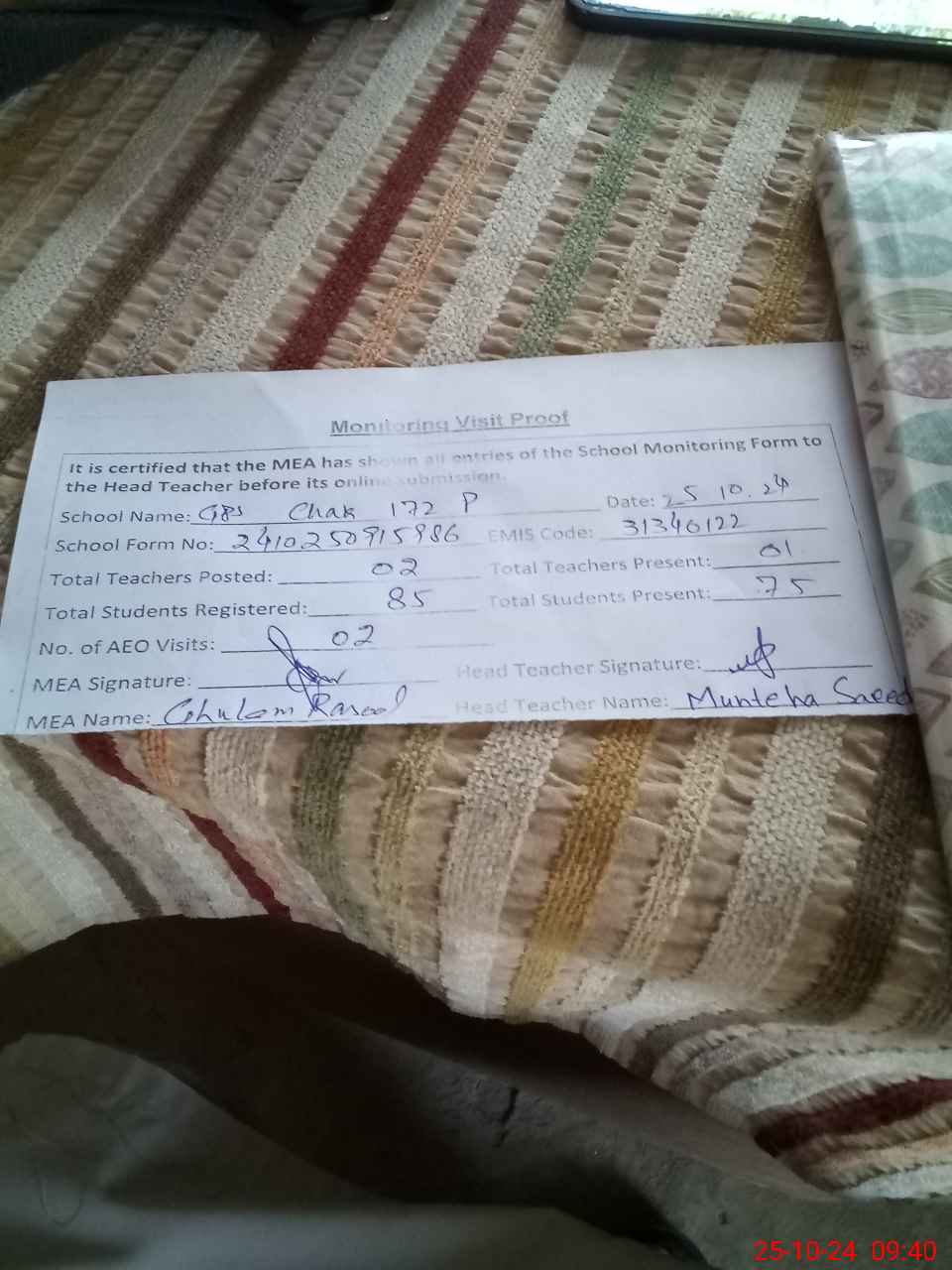 | EMIS Code: 31340122 | Name of School: GPS CHAK NO 172/P | |||