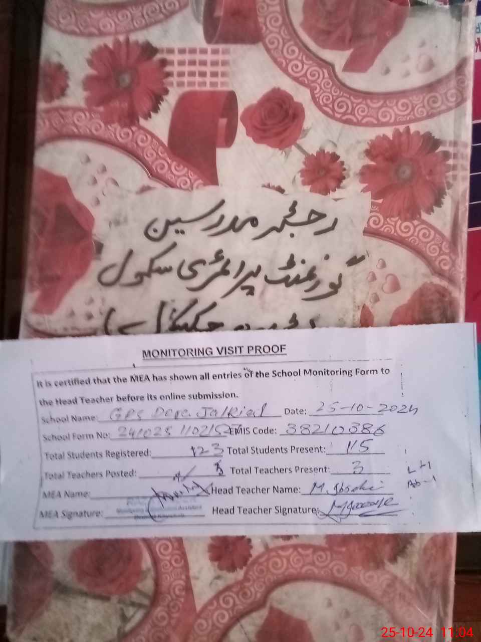 | Certified that this School was Inspected by the Undersigned MEA/DMO Today and the Information Stated Above is as Per Record. | |||||