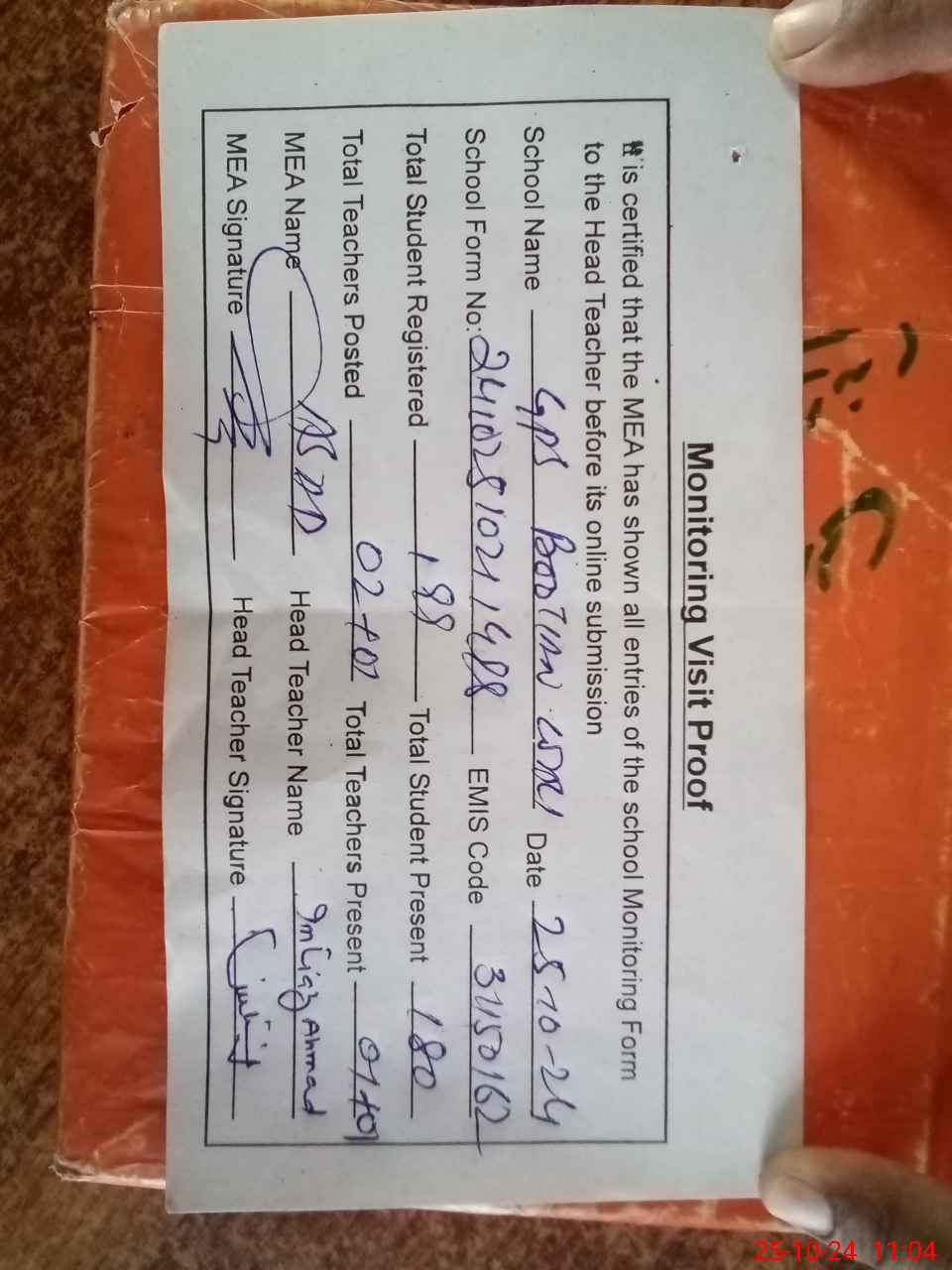 | Attendance Register | Head Teacher | MEA with School | Visit Proof |