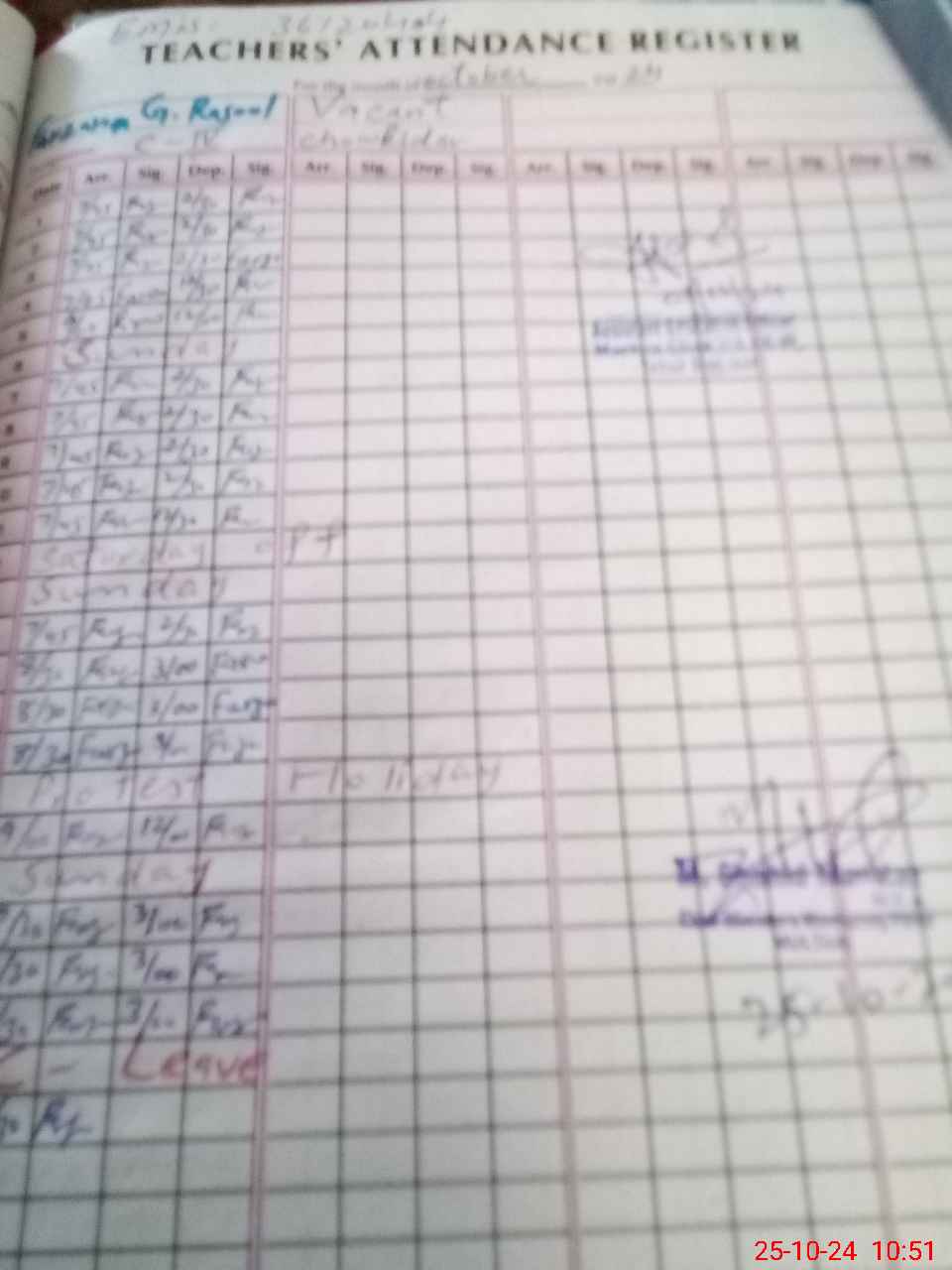 | CNIC | Full Name | Designation | R/C | Absence during last cal. month |