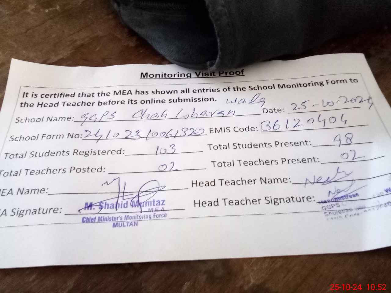 | Monitoring Date: 25-10-2024 | Start Time: 25-10-2024 10:06 AM | End Time: 25-10-2024 10:56 AM | Name of MEA: MU**** SH**** MU**** | |