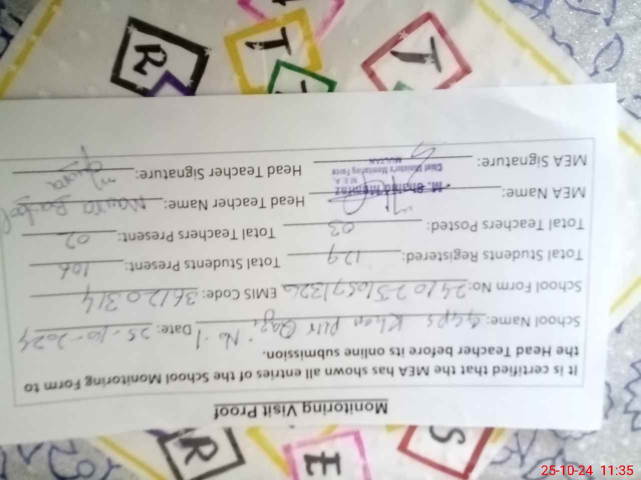 | Attendance Register | Head Teacher | MEA with School | Visit Proof |