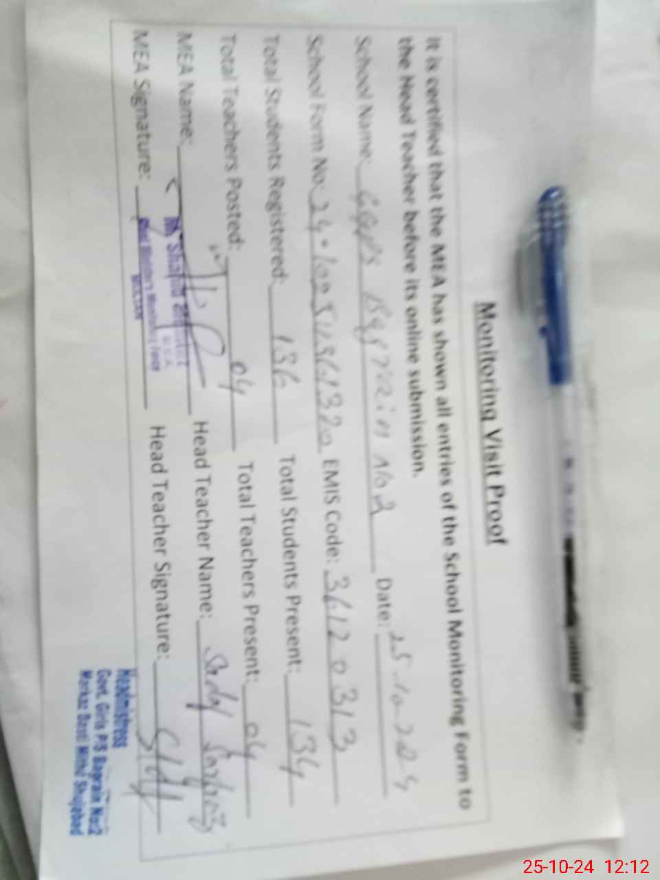 | Attendance Register | Head Teacher | MEA with School | Visit Proof |