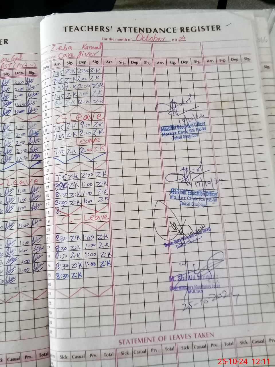 | CNIC | Full Name | Designation | R/C | Absence during last cal. month |