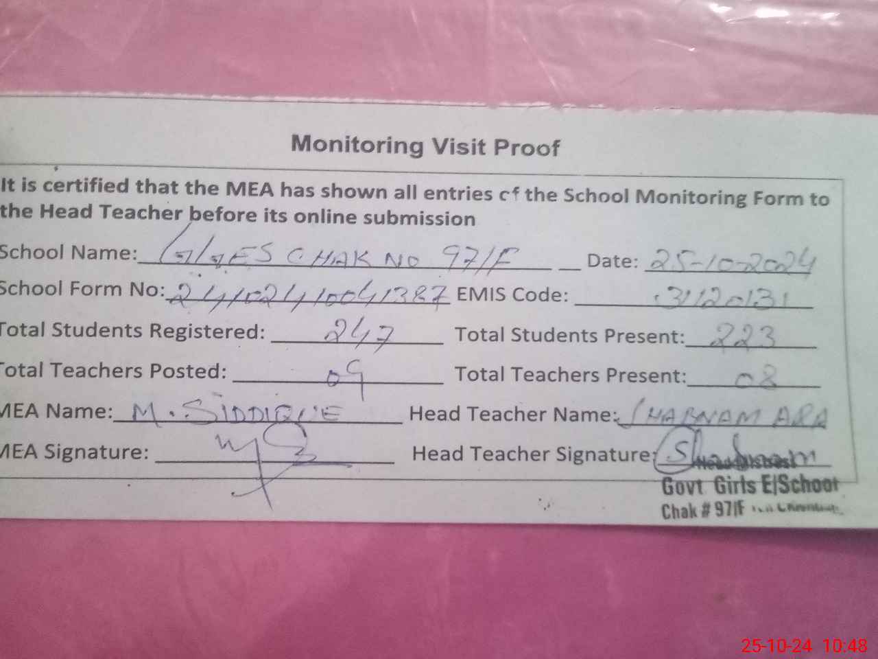 | EMIS Code: 31120131 | Name of School: GGES CHAK NO. 97/F | |||