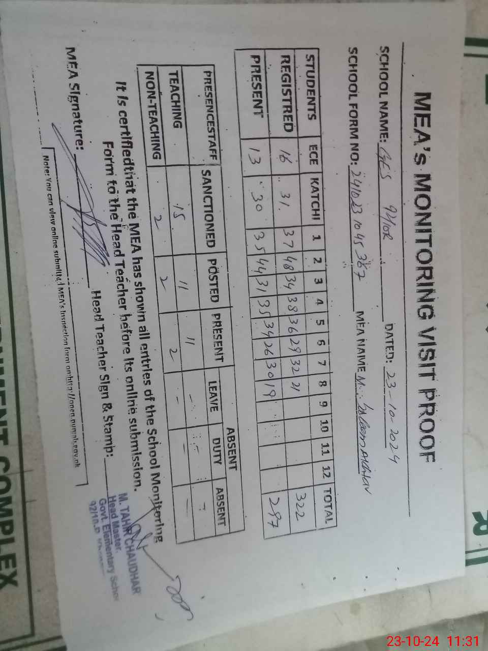 | Attendance Register | Head Teacher | MEA with School | Visit Proof |