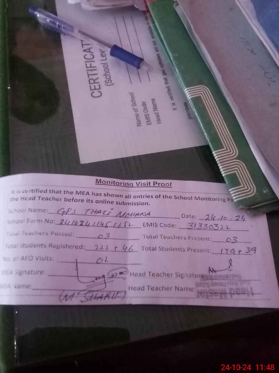 | Certified that this School was Inspected by the Undersigned MEA/DMO Today and the Information Stated Above is as Per Record. | |||||