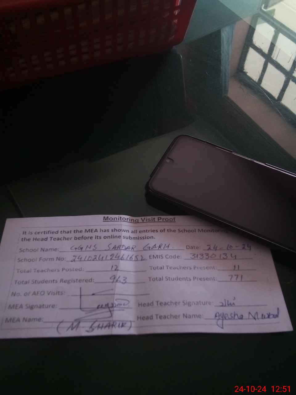 | Attendance Register | Head Teacher | MEA with School | Visit Proof |