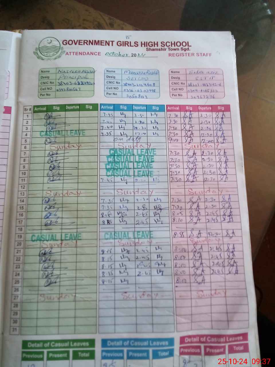 | CNIC | Full Name | Designation | R/C | Absence during last cal. month |