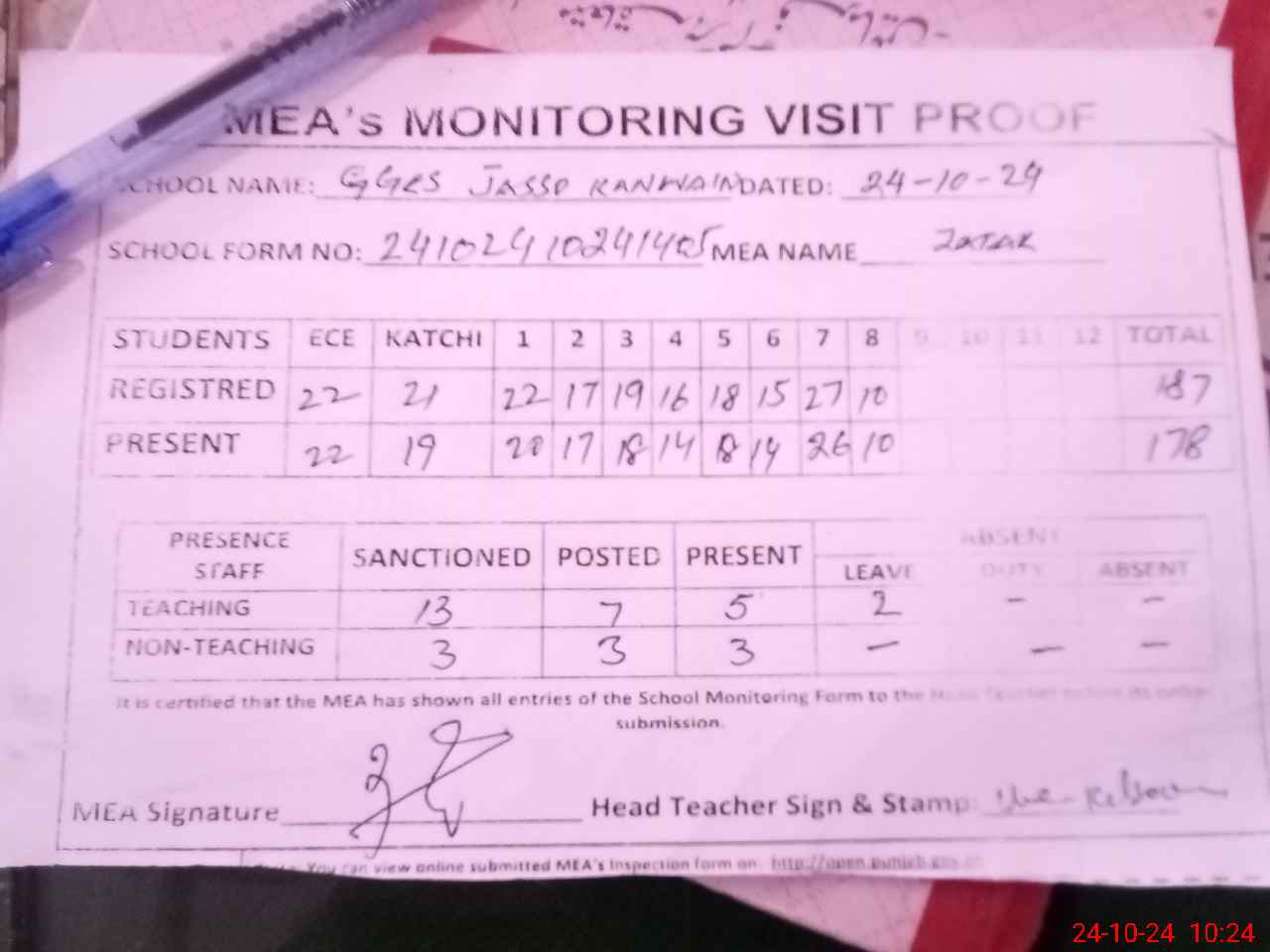 | Attendance Register | Head Teacher | MEA with School | Visit Proof |