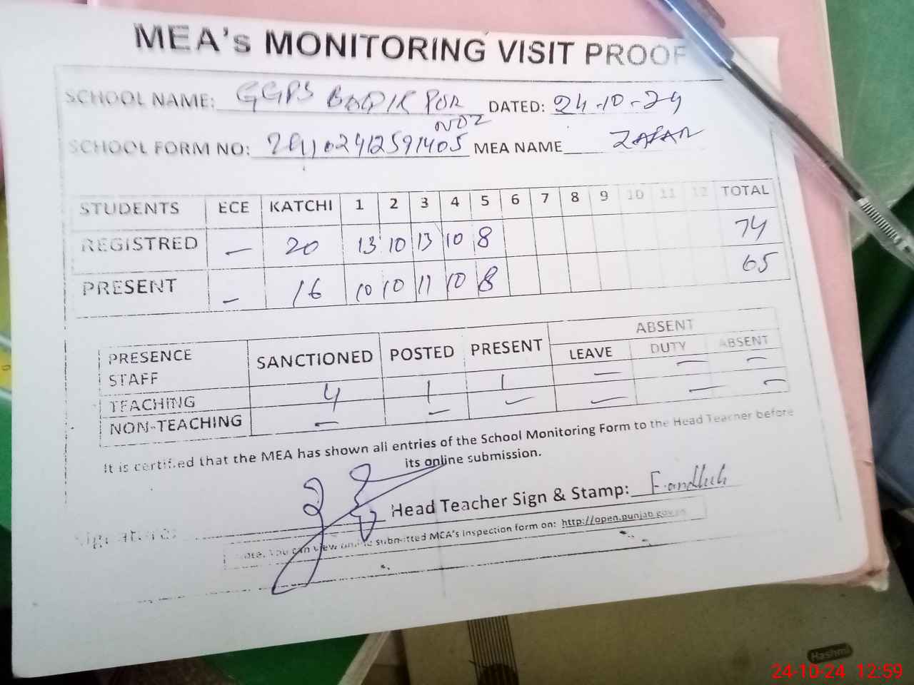 | Attendance Register | Head Teacher | MEA with School | Visit Proof |