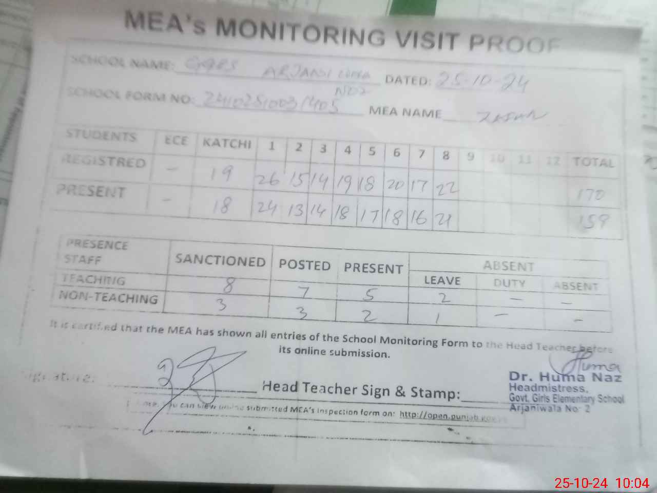 | Certified that this School was Inspected by the Undersigned MEA/DMO Today and the Information Stated Above is as Per Record. | |||||