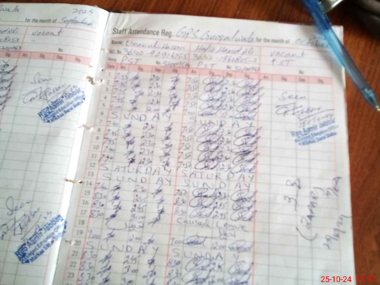 | CNIC | Full Name | Designation | R/C | Absence during last cal. month |