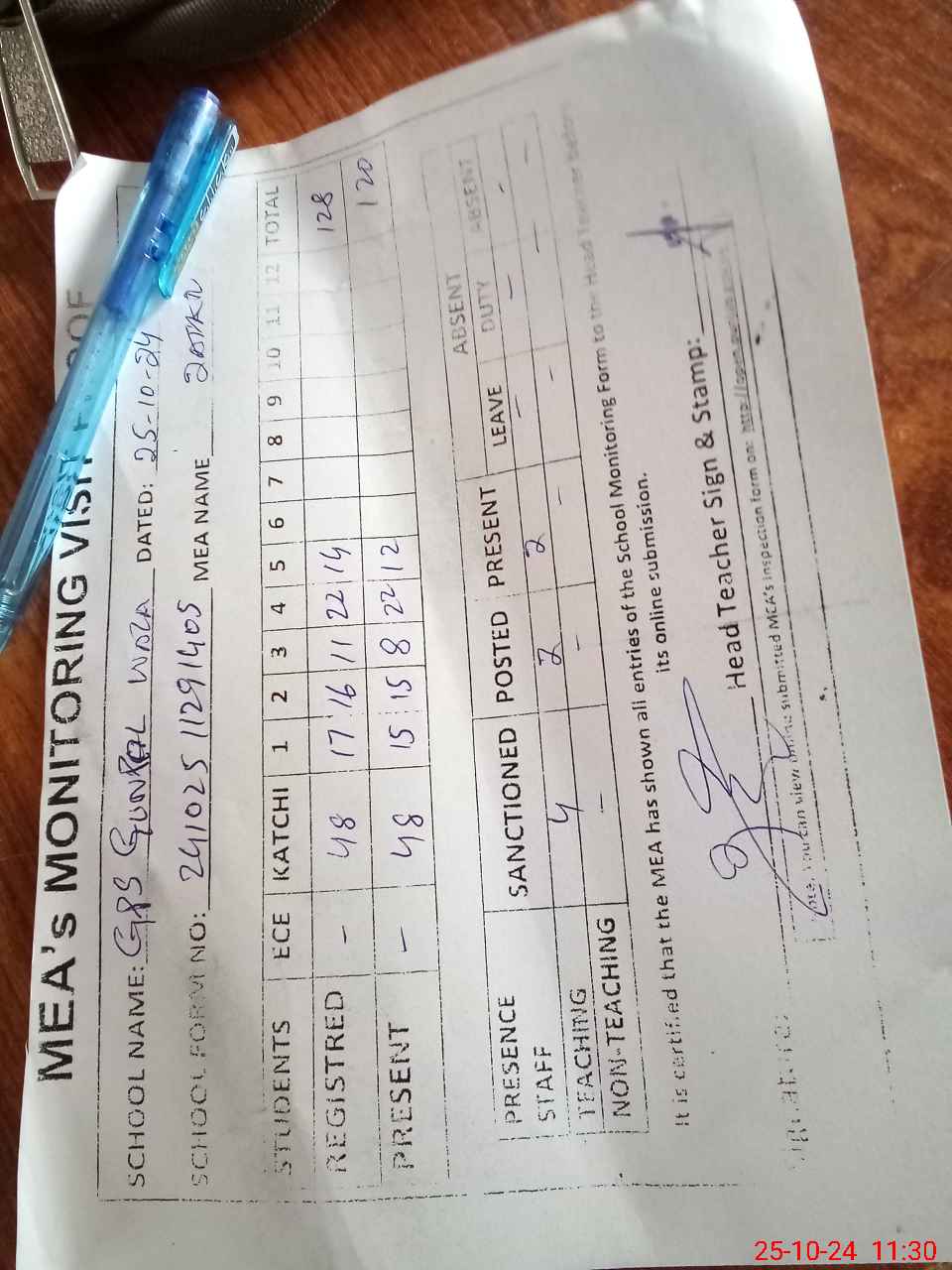 | Attendance Register | Head Teacher | MEA with School | Visit Proof |