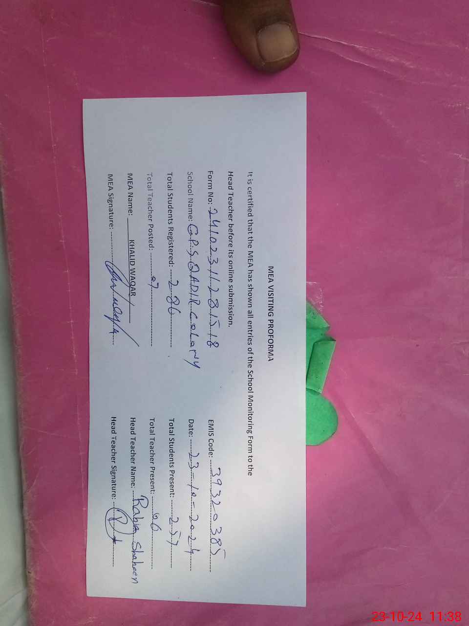 | Certified that this School was Inspected by the Undersigned MEA/DMO Today and the Information Stated Above is as Per Record. | |||||