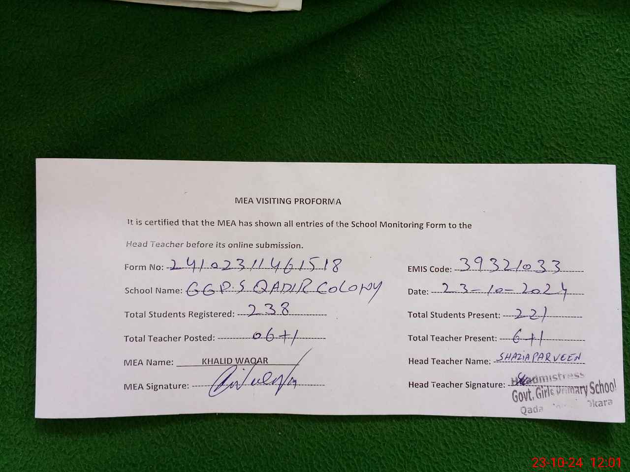 | Attendance Register | Head Teacher | MEA with School | Visit Proof |