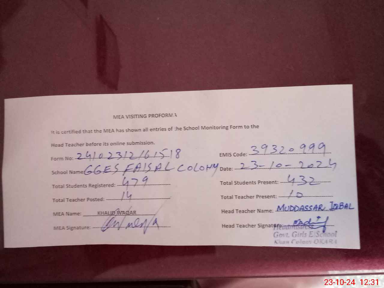 | Attendance Register | Head Teacher | MEA with School | Visit Proof |
