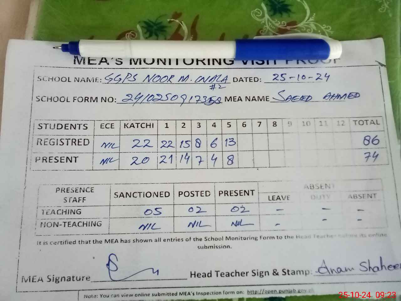 | Attendance Register | Head Teacher | MEA with School | Visit Proof |