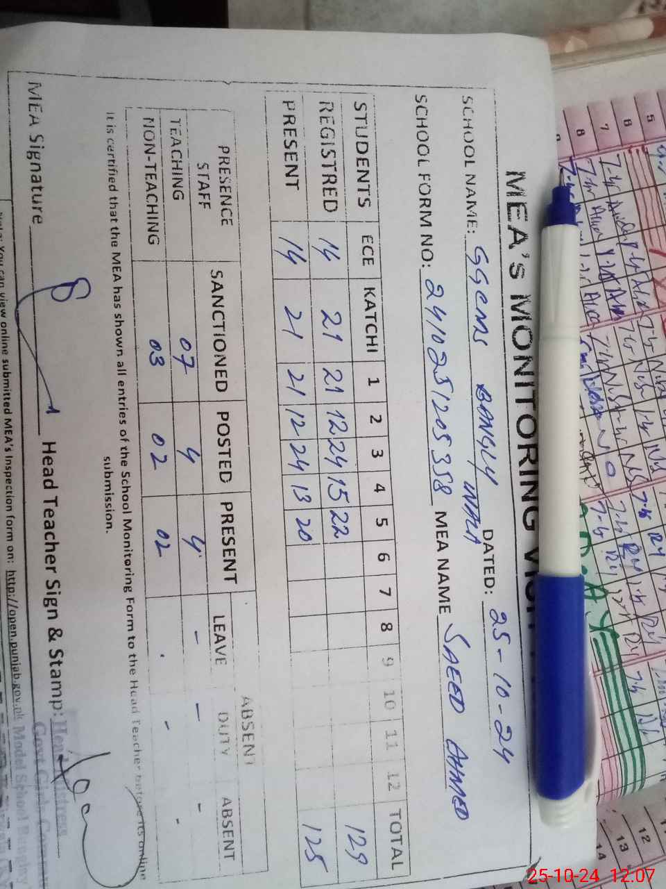 | Attendance Register | Head Teacher | MEA with School | Visit Proof |