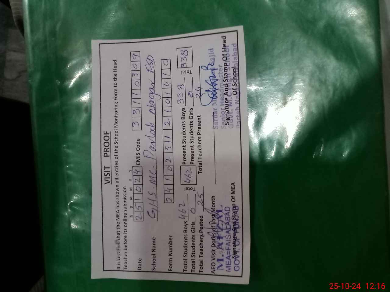 | Certified that this School was Inspected by the Undersigned MEA/DMO Today and the Information Stated Above is as Per Record. | |||||