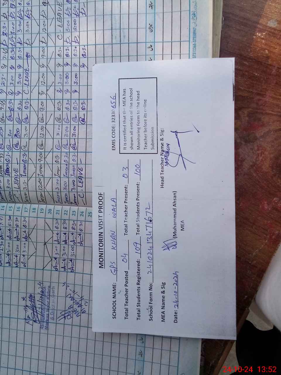 | EMIS Code: 32330656 | Name of School: GPS KHAN WALA | |||