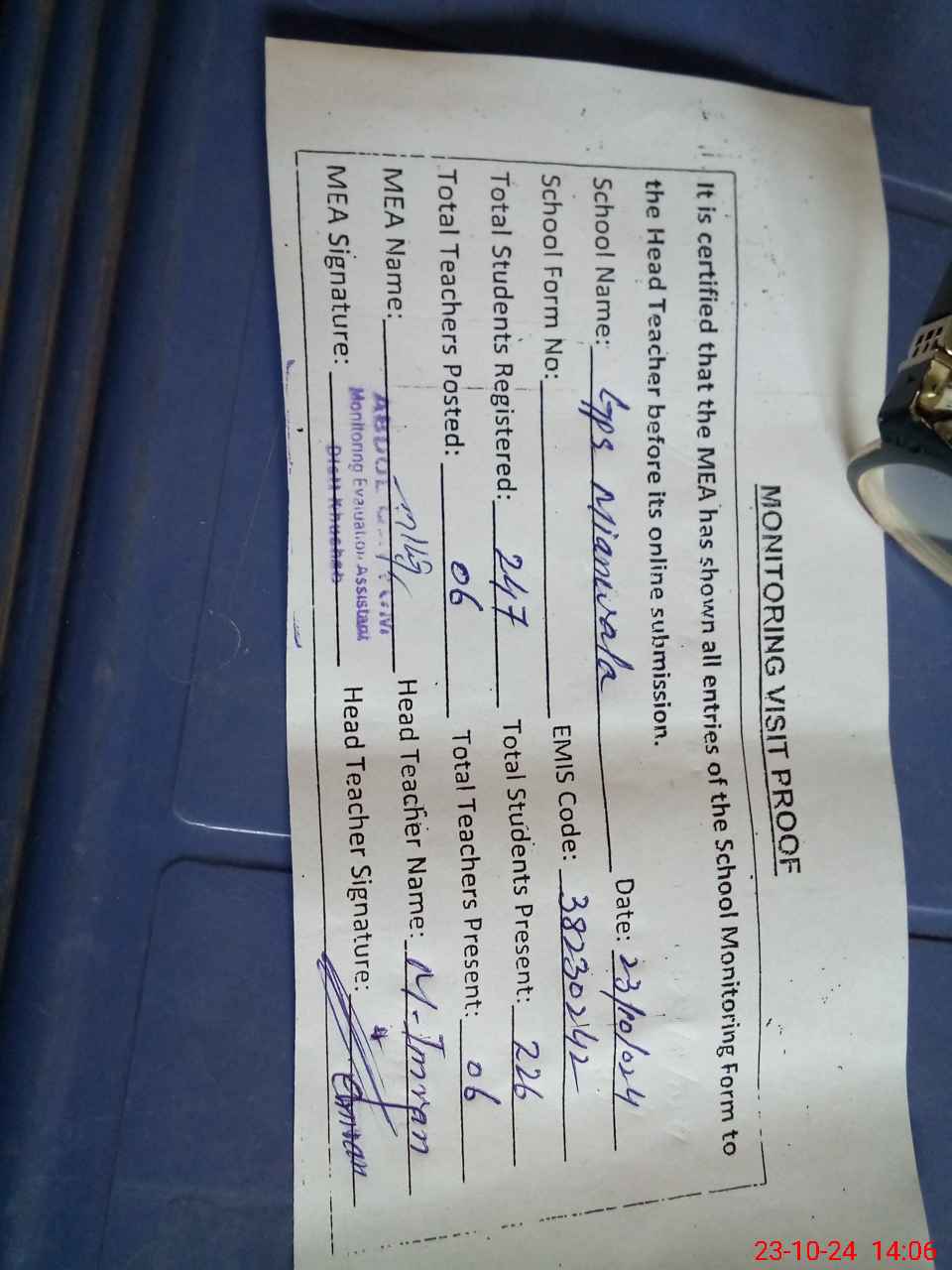 | EMIS Code: 38230242 | Name of School: GPS MIAN WALA | |||