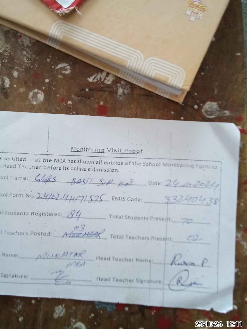 | Attendance Register | Head Teacher | MEA with School | Visit Proof |