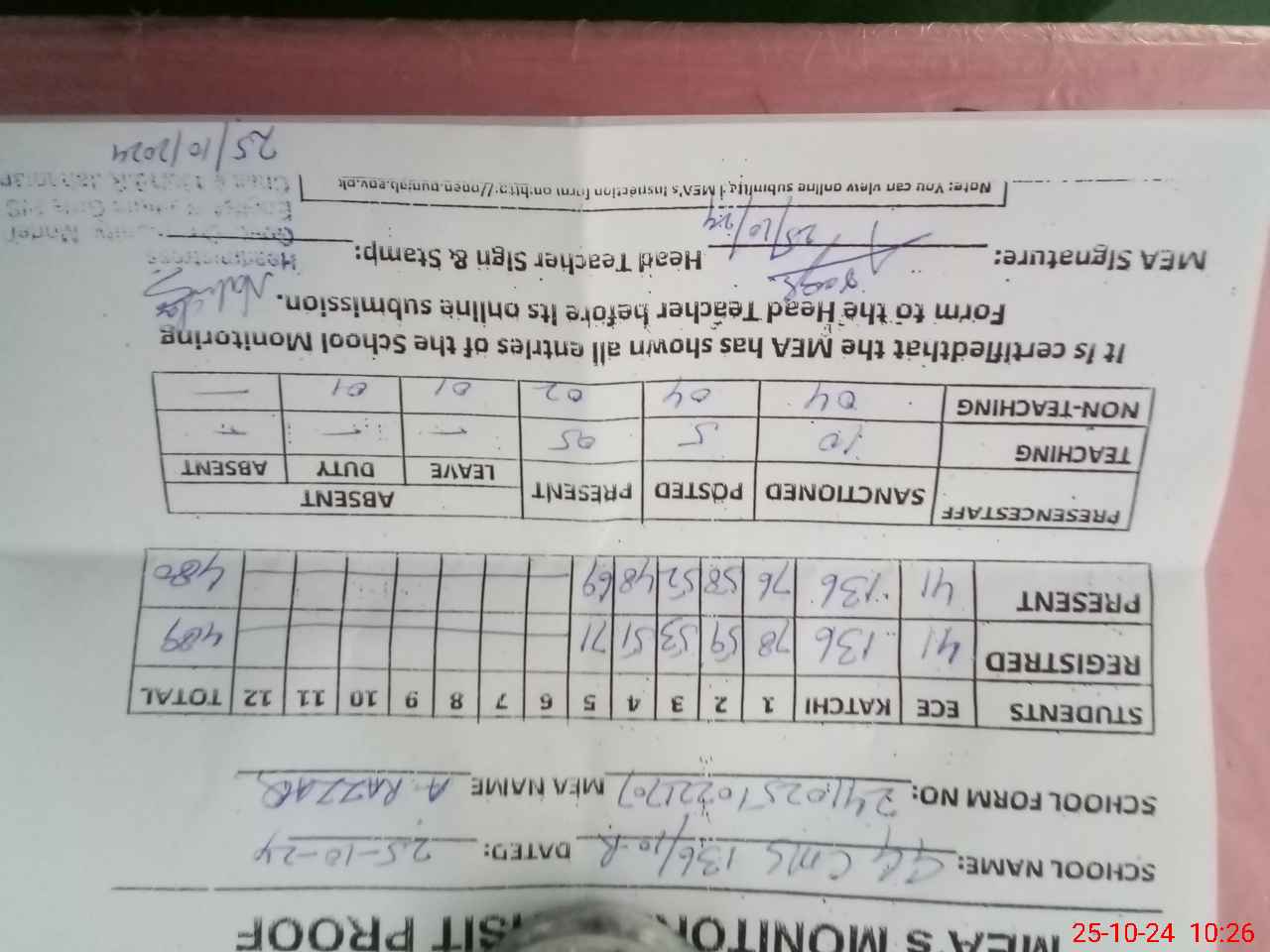 | Attendance Register | Head Teacher | MEA with School | Visit Proof |