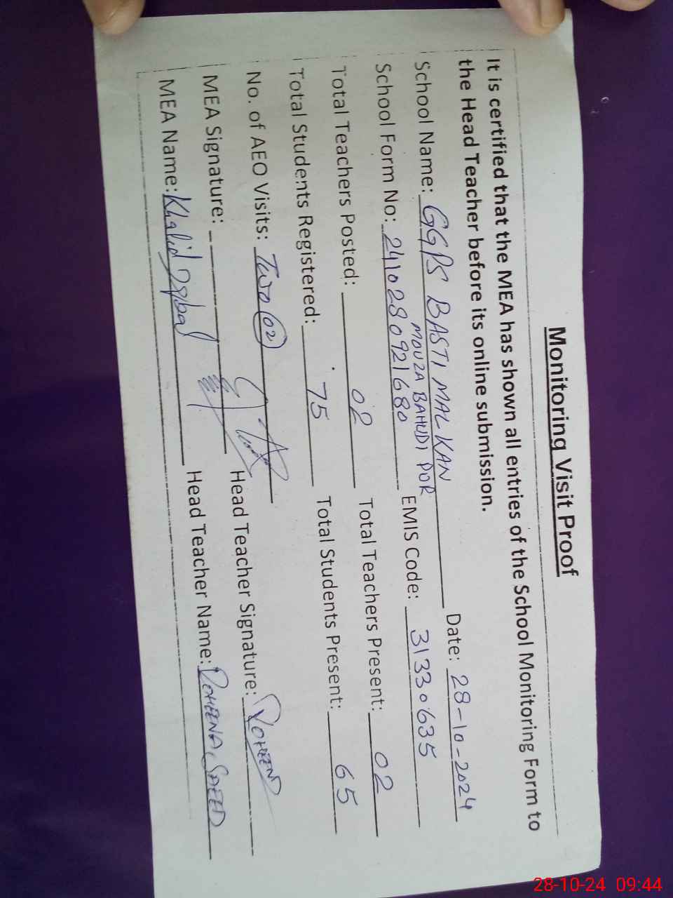 | Certified that this School was Inspected by the Undersigned MEA/DMO Today and the Information Stated Above is as Per Record. | |||||