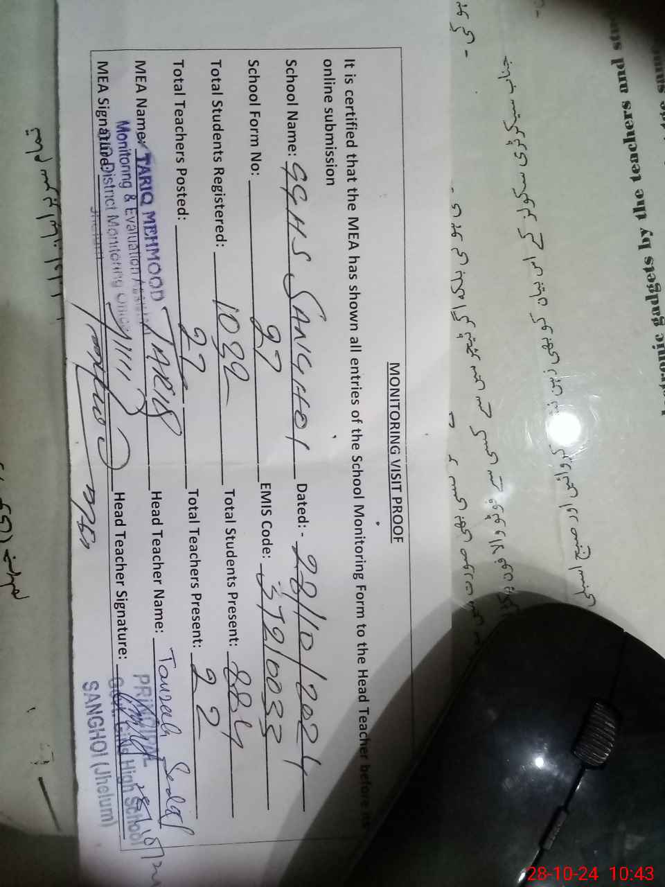 | Certified that this School was Inspected by the Undersigned MEA/DMO Today and the Information Stated Above is as Per Record. | |||||