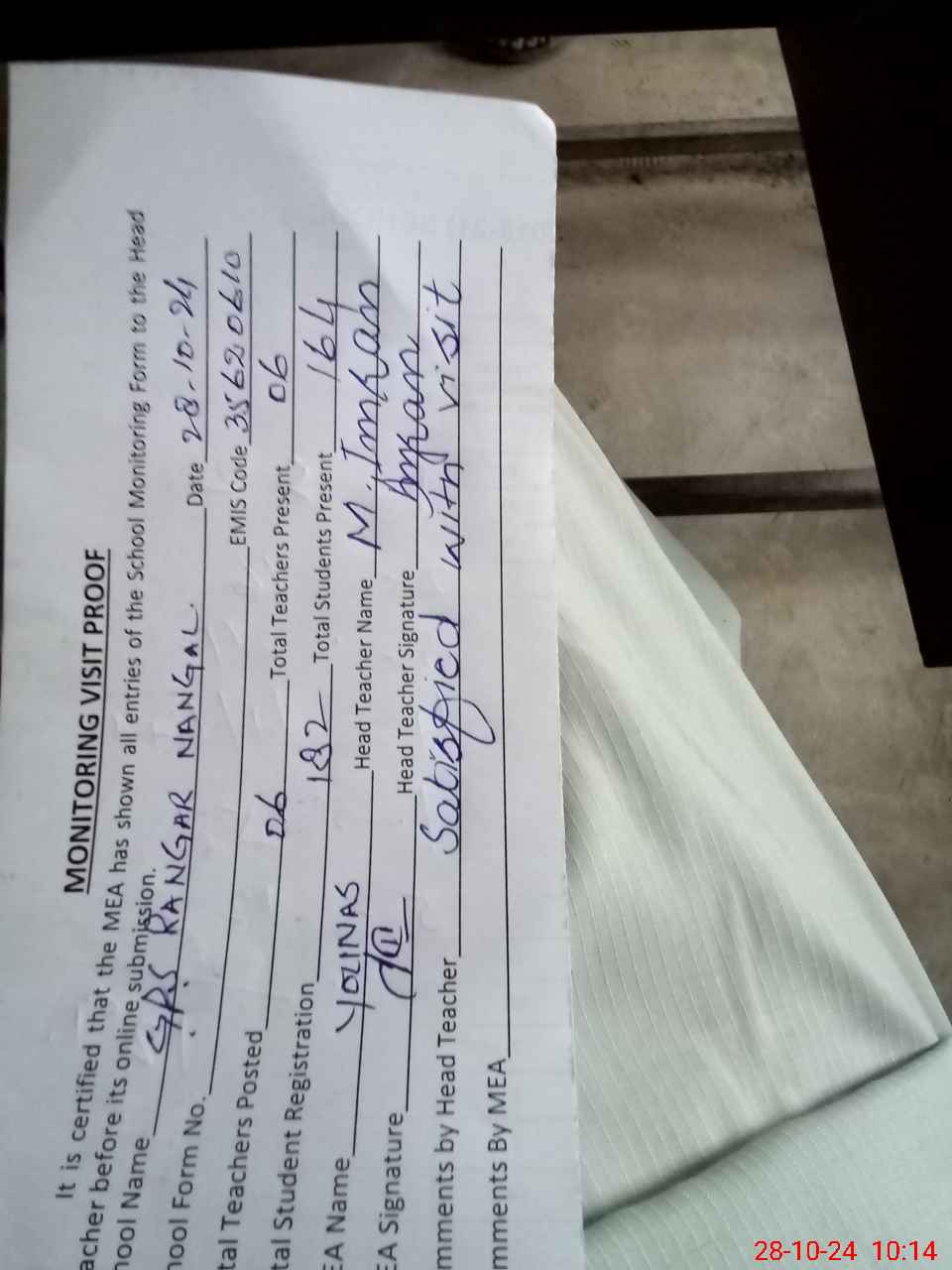 | Certified that this School was Inspected by the Undersigned MEA/DMO Today and the Information Stated Above is as Per Record. | |||||