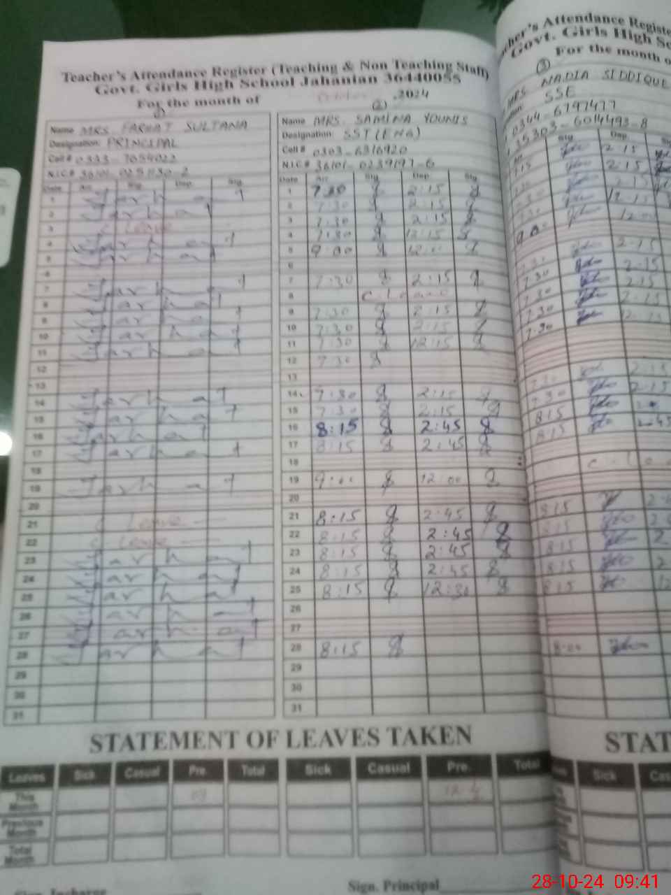 | CNIC | Full Name | Designation | R/C | Absence During Last Calender Month |