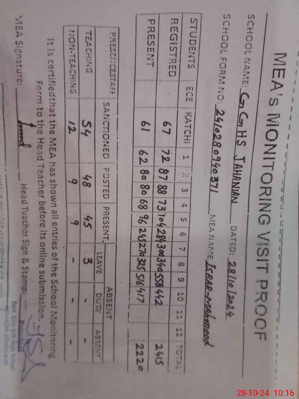 | Attendance Register | Head Teacher | MEA with School | Visit Proof |
