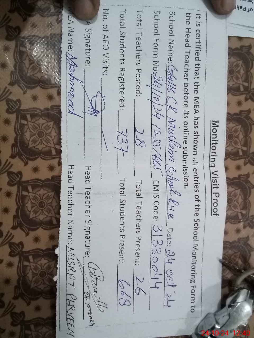 | Monitoring Date: 24-10-2024 | Start Time: 24-10-2024 11:32 AM | End Time: 24-10-2024 12:40 PM | Name of MEA: Ma**** UlHa**** | |