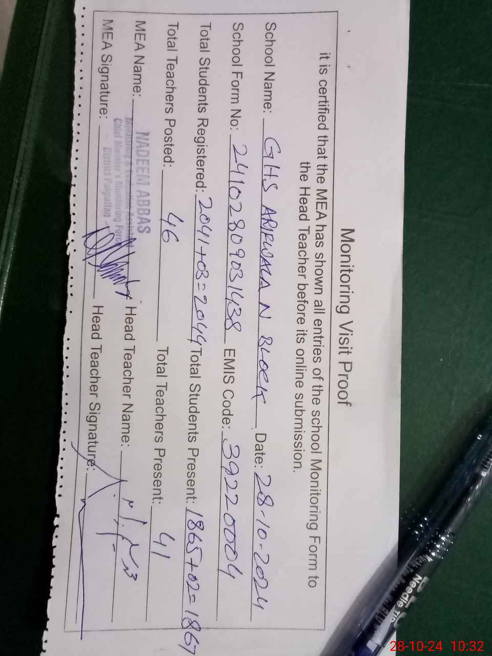 | Certified that this School was Inspected by the Undersigned MEA/DMO Today and the Information Stated Above is as Per Record. | |||||
